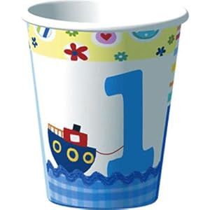 Product Description : Each package of Baby Boy's First Birthday Paper Cups includes 8 cups. Each cup holds 9oz. of your favorite beverage. The cups feature a boat tugging the Number 1 surrounded by bright patterns.